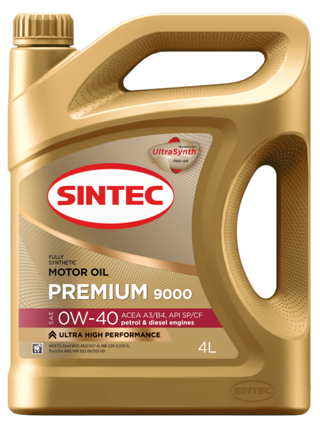 SINTEC Premium SAE 0W-40 API SP/CF ACEA A3/B4 - Синтетическое моторное масло, производится на основе смеси высококачественных синтетических базовых масел и высокоэффективного многофункционального пакета присадок. Синтетическая базовая основа из масел гидрокрекинга, имеющих низкую испаряемость, высокие индекс вязкости и термоокислительную стабильность, дополнительно усилена полиальфаолефинами, обеспечивающими отличную текучесть при отрицательных температурах. Разработано специально для бензиновых и дизельных двигателей легковых автомобилей, в том числе оборудованных турбонаддувом и устройствами доочистки выхлопных газов, где требуется уровень эксплуатационных свойств API SP/CF, ACEA A3/B4. Подходит для применения в двигателях микроавтобусов и малотоннажных грузовых автомобилей.