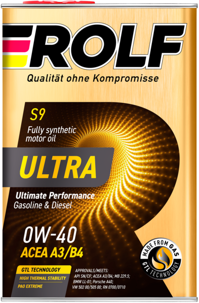 Rolf Ultra 0W-40 A3/B4 SN/CF - Полностью синтетическое моторное масло. роизведено из высококачественных синтетических базовых масел (GTL + PAO) и многофункционального пакета присадок, гарантирует легкий запуск двигателя при низких температурах, превосходную защиту двигателя от износа, препятствует образованию отложений, обеспечивая его максимальную мощность и производительность в любых условиях эксплуатации.