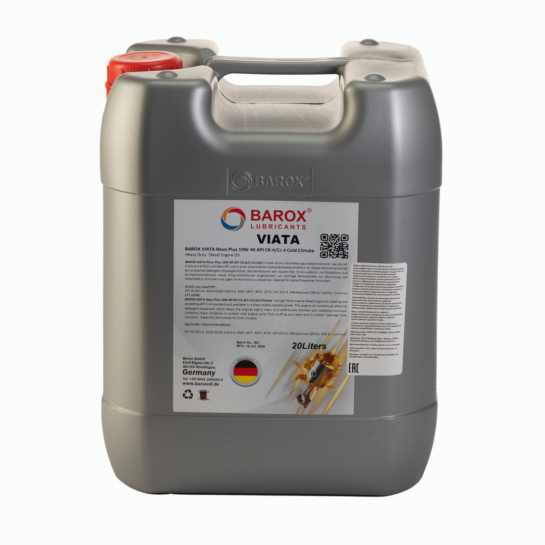 BAROX VIATA REVO PLUS 10W-40 API CK-4/CJ-4, ACEA E6/E9- Высокоэффективное синтетическое моторное масло, соответствующее и превосходящее стандарт API CJ-4. Примененный класс вязкости обеспечивает стабильный показатель устойчивости к сдвигу. Обеспечивает высокую чистоту двигателя за счёт наличия эффективного детергента-дисперсанта. Содержит ингибиторы окисления-коррозии, ингибиторы пенообразования для защиты жизненно важных деталей двигателя от истирания и износа, а также для защиты подшипников от коррозии. Это малозольное моторное масло разработано для продления срока службы и поддержания эффективности систем снижения токсичности отработавших газов автомобилей с дизельным двигателем.