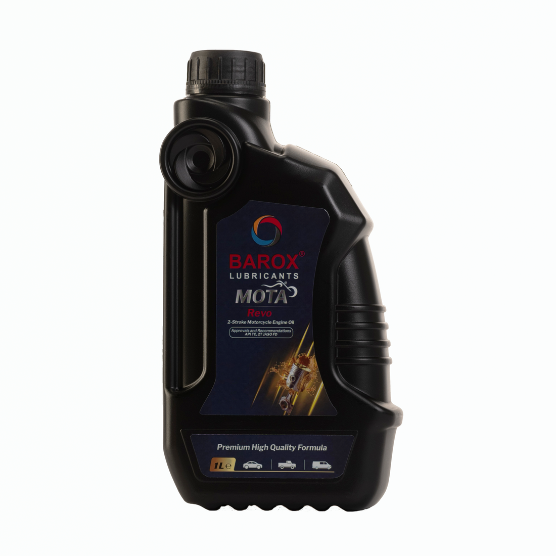 BAROX MOTA REVO 2T TC JASO FD- . Это минеральное моторное масло для двухтактных мотоциклетных двигателей малого объема, созданное на основе высококачественных минеральных базовых масел в сочетании со сбалансированными присадками для достижения оптимальных свойств.