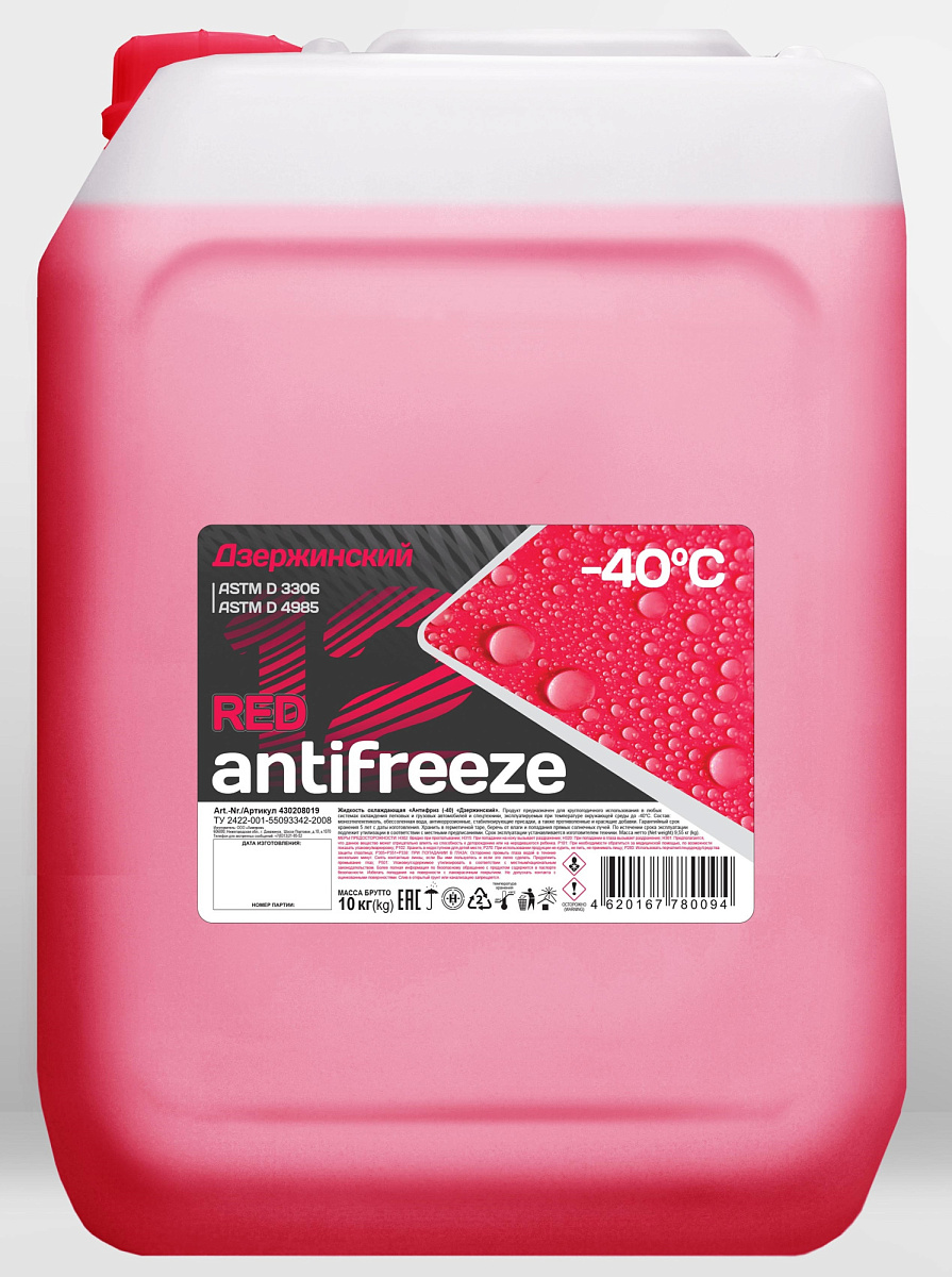 Карбоксилатный антифриз «Дзержинский» Red G12. Произведен из высококачественного этиленгликоля с добавлением современного комбинированного пакета присадок на основе карбоновых кислот. Продукт готов к применению. Применять при температуре окружающей среды не ниже -40°С.