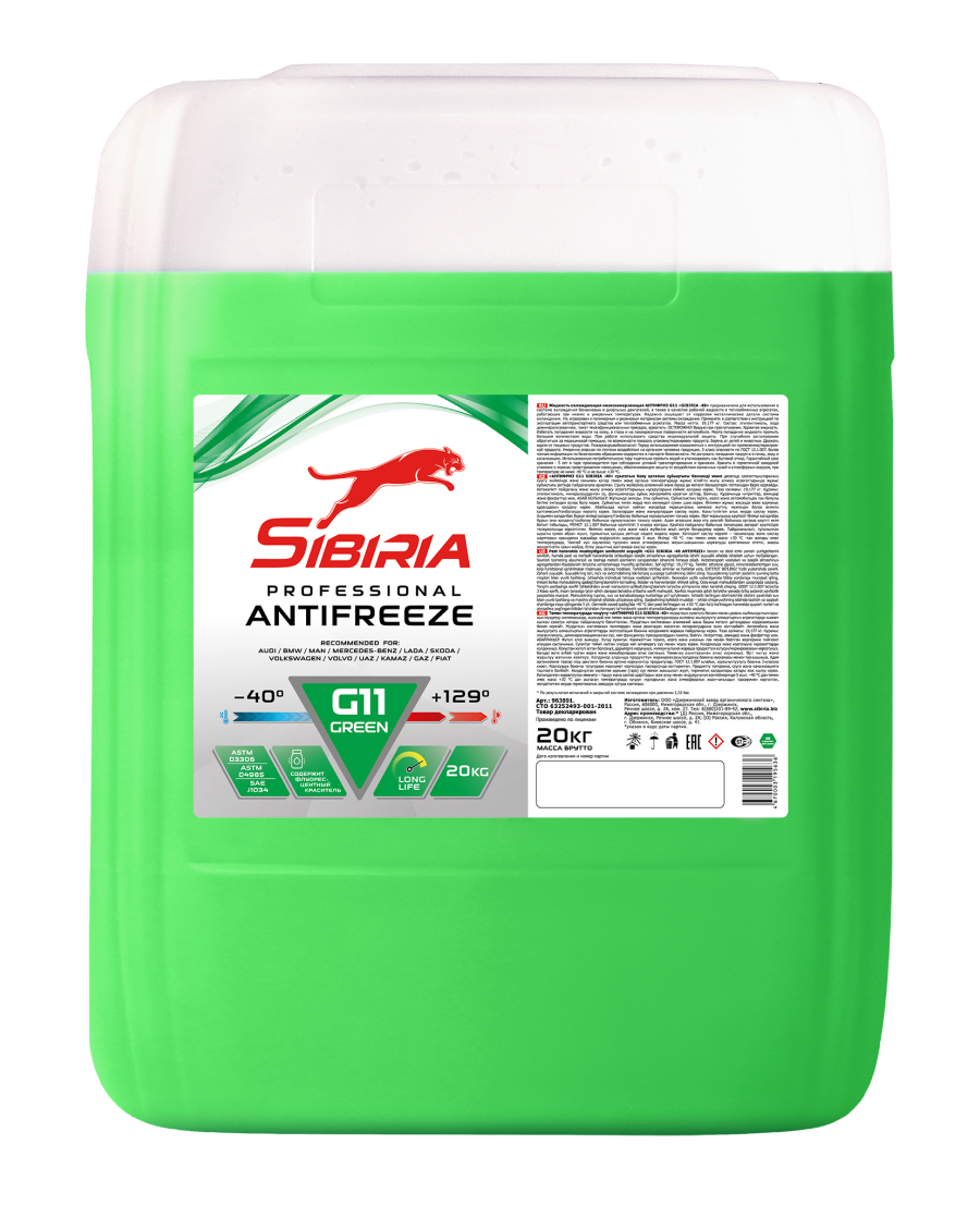 Антифриз SIBIRIA G11 Green - Жидкость охлаждающая низкозамерзающая/ В охлаждающей системе используется в рабочем диапазоне температур от -40 °С до +129 °С.