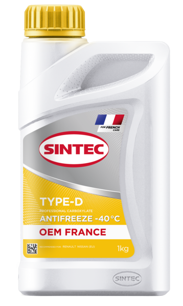 Sintec Antifreeze OEM France Type-D yellow -40 – готовая к применению охлаждающая низкозамерзающая жидкость. Изготовлена из высококачественного моноэтиленгликоля и пакета присадок на основе карбоксилатной технологии OAT, специально адаптированной для применения в автомобилях производства группы Renault-Nissan. Не содержит нитритов, нитратов, аминов, фосфатов, боратов и силикатов.