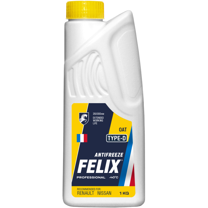 Антифриз FELIX® Type-D представляет собой смесевую композицию на основе водного раствора этиленгликоля, воды и карбоксилатного пакета стабилизирующих и антикоррозионных присадок, содержащих противопенные и красящие добавки. Рекомендован к заливке в автомобили RENAULT, NISSAN.