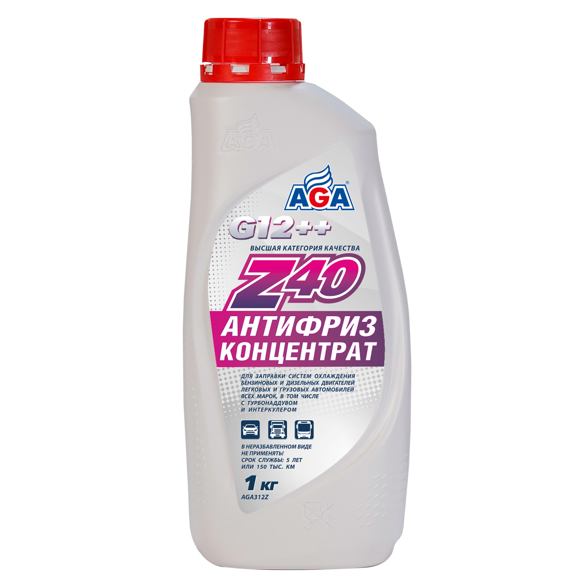 AGA-Z40 – универсальный антифриз высшей категории качества. Концентрат AGA-Z40 предназначен (после разбавления водой) для заправки систем охлаждения бензиновых и дизельных двигателей легковых и грузовых автомобилей всех марок, а также автобусов. Идеален для высокофорсированных двигателей, работающих в тяжелых условиях.