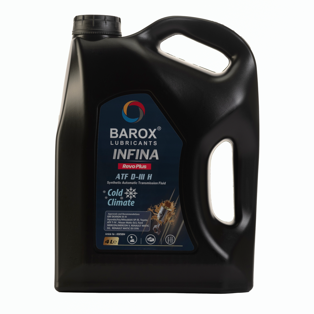 BAROX INFINA REVO PLUS ATF D-III - Жидкость для автоматических трансмиссий. Изготовлена из синтетических базовых масел в сочетании с новейшими высокоэффективными присадками. Превосходный состав обеспечивает оптимальную стабильность к старению, отличную защиту от износа и хорошие фрикционные характеристики.