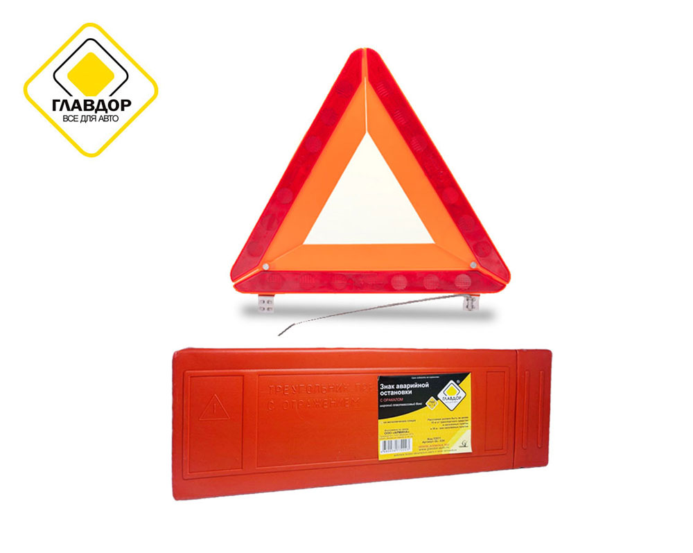 Знак аварийной остановки "Главдор" выполнен из пластика, оснащен пластиковой вставкой (оракалом). Треугольный, с отражением.