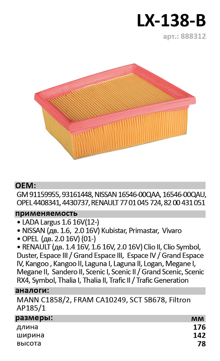 RENAULT (дв. 1.4 16V, 1.6 16V, 2.0 16V) Clio II, Clio Symbol, Duster, Espace III / Grand Espace III, Espace IV / Grand Espace IV, Kangoo , Kangoo II, Laguna I, Laguna II, Logan, Megane I, Megane II, Sandero II, Scenic I, Scenic II / Grand Scenic, Scenic RX4, Symbol, Thalia I, Thalia II, Trafic II / Trafic Generation