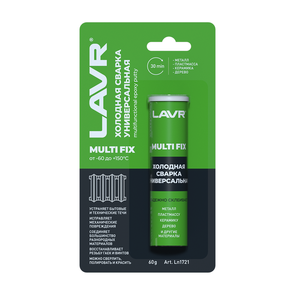 Холодная сварка Универсальная MultiFIX LAVR Ln1721 Двухкомпонентный состав быстро и прочно соединяет черные и цветные металлы, бетон, дерево, пластик, стекло, керамику и другие материалы. Подходит для ремонта радиаторов, бензобаков и несложных кузовных работ, восстанавливает резьбу гаек и винтов. Соединение не уступает по прочности сварному шву.