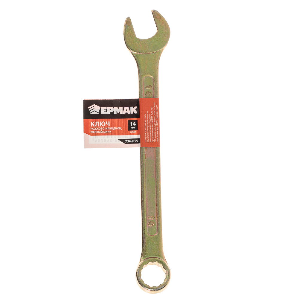Рожково-накидной ключ ЕРМАК 14мм, желтый цинк 736-059 подходит для стандартного шестигранного крепежа. Инструмент имеет прочное тело с ребрами жесткости.