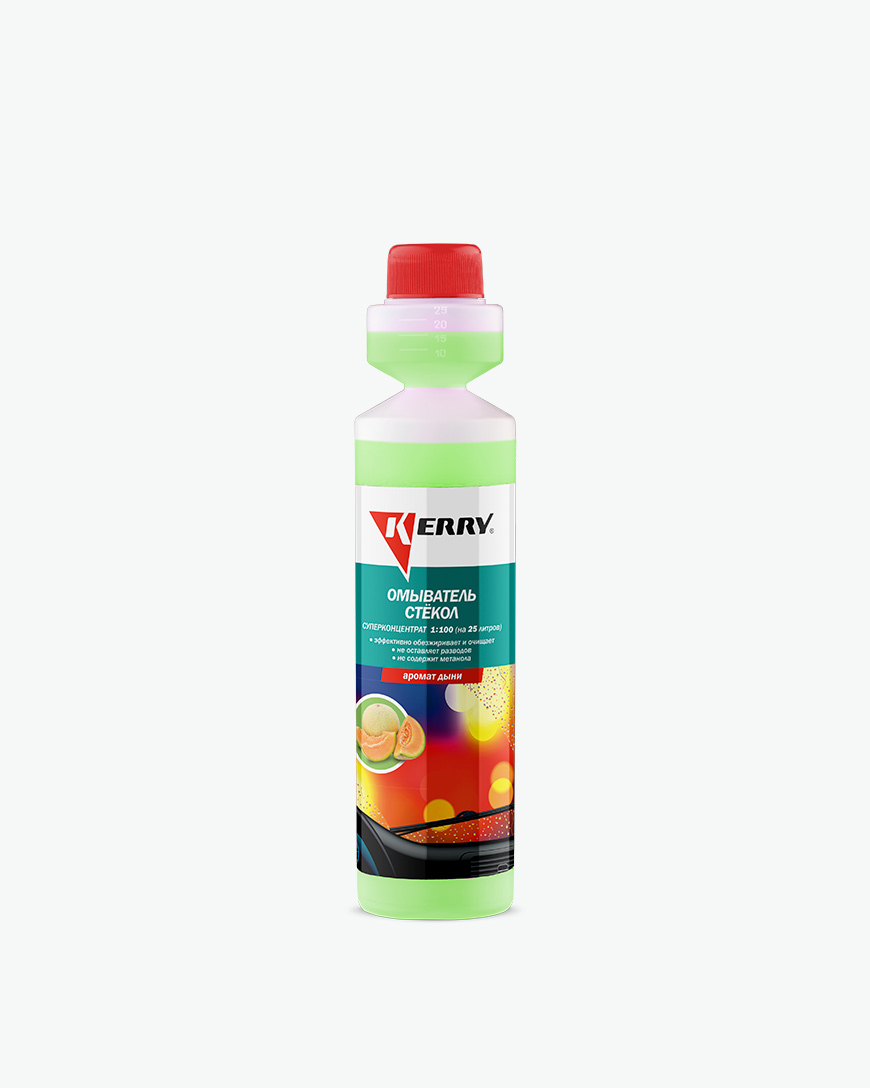 Омыватель стекол. Аромат дыни. Суперконцентрат. Содержимое флакона при смешивании с водой в соотношении 1:100 позволяет приготовить 25 литров летней стеклоомывающей жидкости. Омыватель стекол KERRY® KR-333 (Аромат дыни), благодаря содержанию комплекса поверхностно-активных добавок, быстро и эффективно удаляет дорожную грязь, масляные пятна, следы насекомых, птичий помёт, смолу растений. Обеспечивает идеальную чистоту фар, лобового и заднего стёкол автомобиля. Не оставляет радужной плёнки. Улучшает обзор. Предохраняет стёкла и щётки от абразивного износа. Безопасен для лакокрасочных покрытий, резиновых и пластиковых деталей.