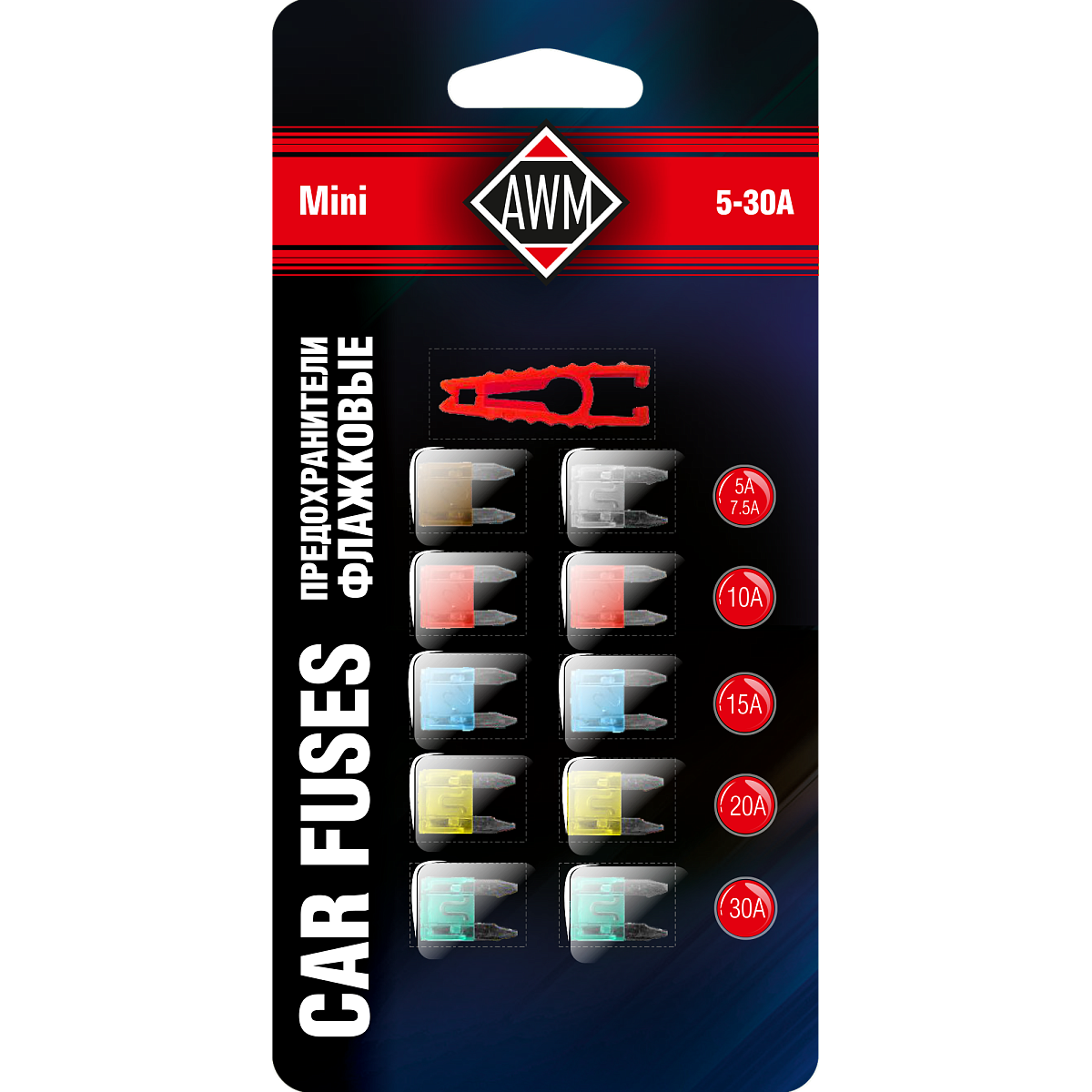 Автомобильные предохранители AWM предназначены для защиты цепи электрических соединений в автомобиле от коротких замыканий. Корпус предохранителей изготовлен из термоустойчивого, не поддерживающего горение полиамида. Имеют плавкую вставку из высококачественного сплава цинка. Наличие специального пинцета в комплекте позволяет удобно извлекать перегоревшие предохранители из диагностической коробки.