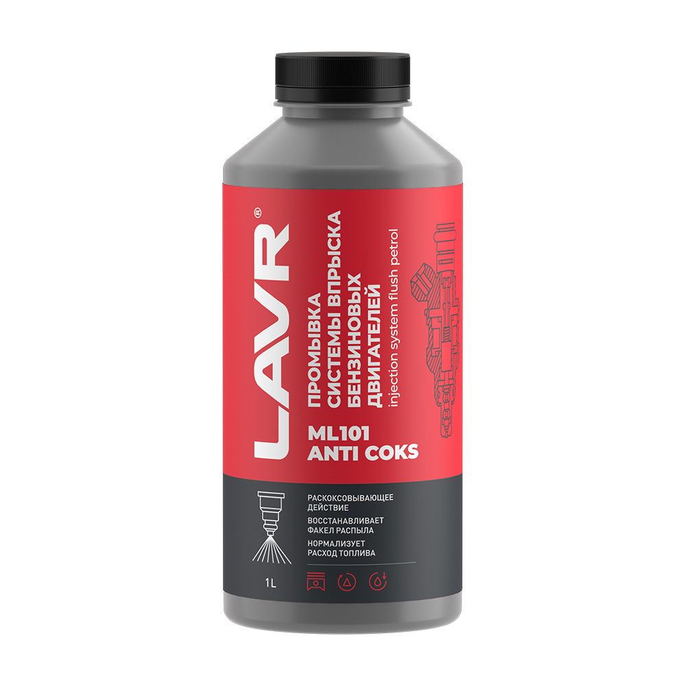 Промывка инжекторной системы бензинового двигателя ML101 LAVR Ln2001 – промывка с раскоксовывающим эффектом для безразборной очистки бензиновых систем впрыска. Запатентованный пакет моющих присадок LAVR ISP/DET™ восстанавливает факел распыла форсунок, устраняет кокс и нагар с днищ поршней и поршневых колец. В системах распределенного впрыска жидкость очищает еще и впускные клапаны. Промывка устраняет до 100% загрязнений в форсунках. Не требует замены масла и свечей зажигания. Средство совместимо с любыми пневматическими станциями, подходит для бензиновых двигателей с электронными системами впрыска любого типа.