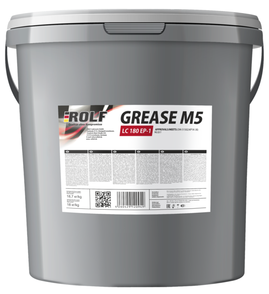 ROLF GREASE M5 LС 180 EP – 1 универсальная пластичная смазка произведенная на смеси минеральных, и изопарафиновых масел, с использованием синтетических технологий, загущенные литиево-кальциевым мылом, с добавлением высокоэффективного пакета присадок увеличивающих, адгезионные, антикоррозионные, антифрикционные свойства пластичной смазки, позволяющие применять данный смазочный материал в широком спектре как тяжелой так и средней промышленности.