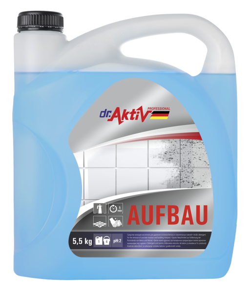 Средство, моющее кислотное для удаления остатков бетона и строительных смесей Dr. Aktiv AUFBAU. Предназначено для финишной очистки кафельной плитки, стекла, гранита после строительных и ремонтных работ.