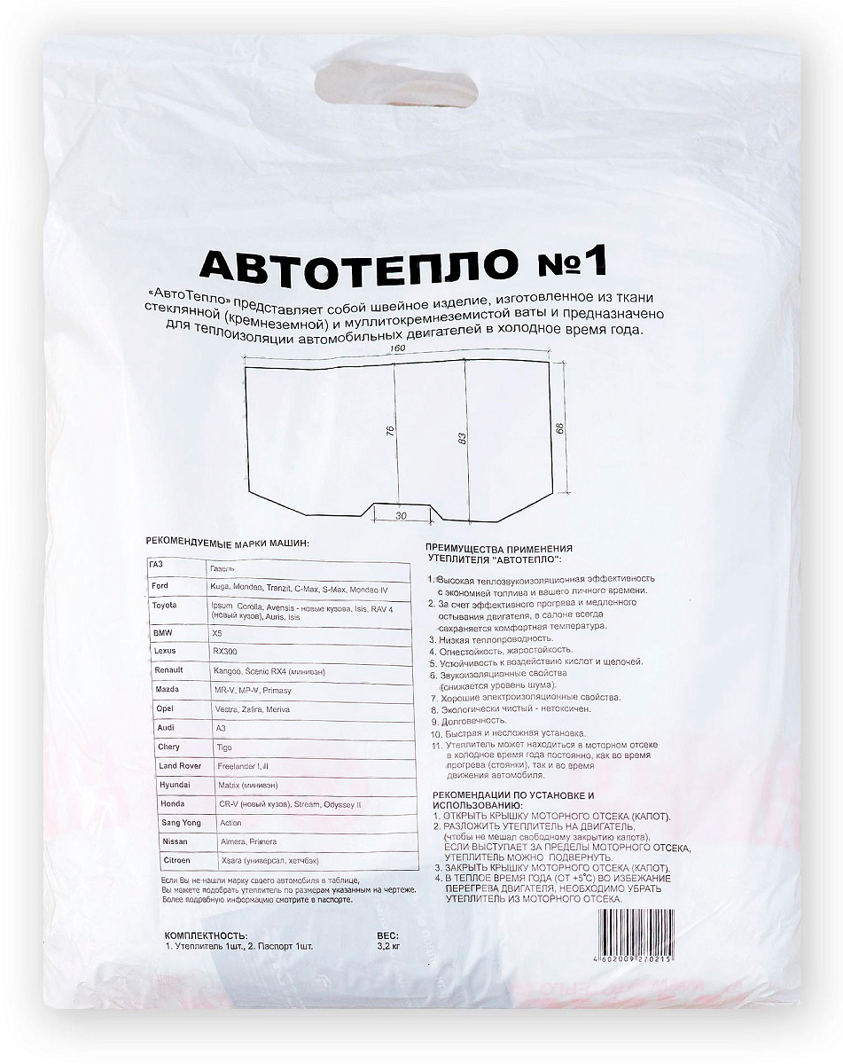 Автотепло №1 утеплитель автомобильный огнестойкий 160х83 см. - Автотепло рекомендуется начинать использовать поздней осенью при минусовой температуре. В теплое время года (от +5 С) во избежание перегрева двигателя необходимо убрать утеплитель из моторного отсека. Не подлежит стирке! Только сухая чистка.