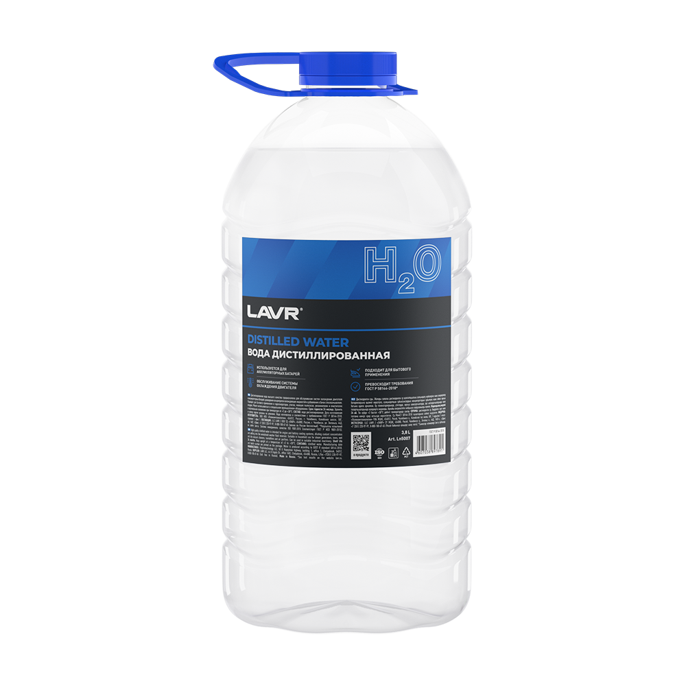 Дистиллированная вода высшей категории качества для обслуживания систем охлаждения ДВС и аккумуляторных батарей, разведения концентратов, использования в качестве омывающей жидкости. Вода изготовлена в соответствии с требованиями ГОСТ 6709-72.